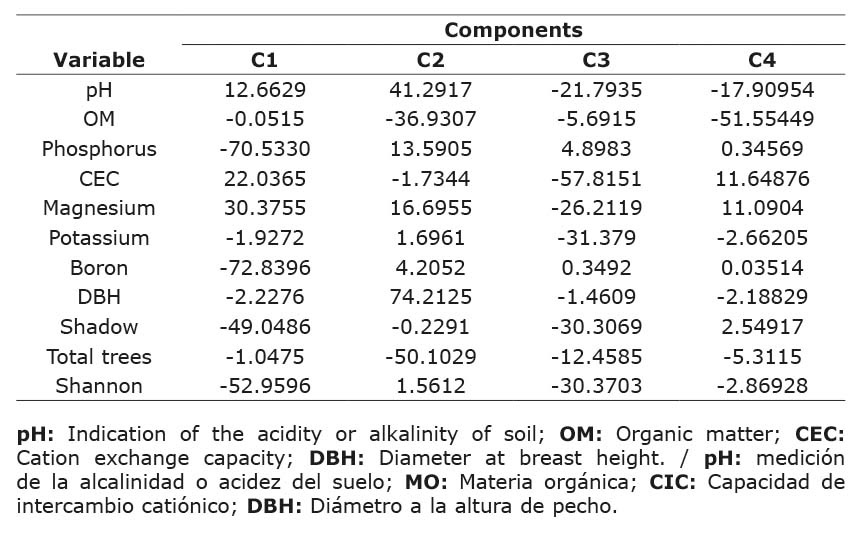 The principal component analysis ordination (Figure 1) showed a slight clustering of the variables Shanon-Weiner Index, amount of shade, and boron content, which were represented in the coffee systems with fruit trees and coffee with Musaceae. Similarly, total trees, OM, pH, bulk density, and DBH had a strong influence on component 2.