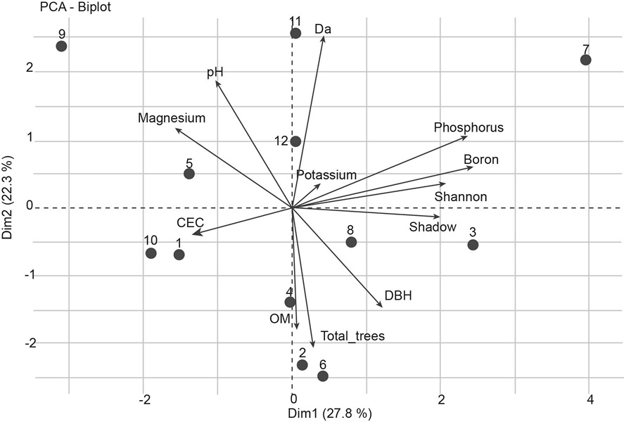 The Principal Component Analysis (PCA) made it possible to form four large factors to explain 81 % of the total variation evaluated (Table 5). The first factor explains 28 % of the variability and is mainly composed of the variables boron (-72.84), phosphorus (-70.5), Shannon (-52.96), and shade (-49.05). This shows that the lack of the tree component that casts shade on the coffee makes the soil present greater phosphorus retention, due to the traditional tillage management. The second factor, which explained 50 % of the variability observed, was mainly composed of the variables total trees per hectare (-50.10), organic matter (-36.93), and diameter at breast height (-25.068), where bulk density and pH stood out. The third factor, which explained 69 % of the total variation related to cation exchange capacity (CEC) (-57.82), soil potassium content (-31.38), shade (-30.37), and Shannon index (-30.31). Finally, the fourth factor showed an 81 % explanation of the variability with the highest contribution of organic matter (-51.55) in this component (Table 6).