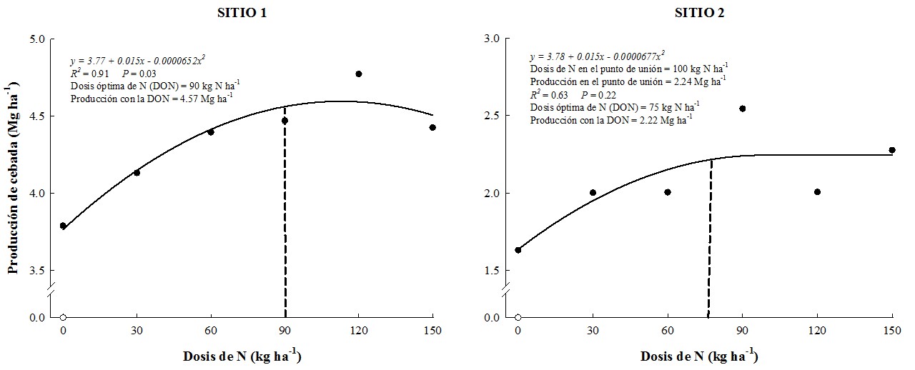 The objective of this investigation was to evaluate the response of barley production to nitrogenized fertilization (NF) and its impact on the protein content of the grain and the availability of nutrients on the soil. The study was carried out in two sites in Hacienda Valencia, in Pintag, Quito, Ecuador, between March 2014 and February 2015. A variety of INIAP Cañicapa 2003 was used, and the NF was done with normal urea and polymerized (urea + tiophosphate of N-nbutiltriamida). An experimental design of randomized full blocks in four repetitions of divided lots [the urea (normal and polymerized) was used in the main lot and the NF (0, 30, 60, 90, 120, y 150 kg N/ha) in the sub-lot]. 110 kg/ha of seed was used; 50% of the NF was applied three weeks after planting (broadcast) and 50% eight weeks after. The type of urea did not affect the production (p>0,10), although the average was different between two sites (4,33 y 2,08 t/ha for sites 1 and 2, respectively). Excess of rain could have limit the effect on the urea type. On average a cuadratic response to NF was obtined, with an optimum dose of N (DON) of 90 kg N/ha and a production of 3,41 t/ ha. This DON was similar to the dose of N recomended for barley in Ecuador. The NF augmented the protein content up to 14,50% (p<0,01) and acidified the ground, because the urea nitrification produces H+.