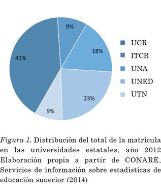 En general, para el conjunto de las 5 universidades estatales del país, la información que, para el año 2012 proporciona el Consejo Nacional de Rectores (CONARE), registra una cantidad total de 93,387 estudiantes, distribuida proporcionalmente según se muestra en la figura 1.