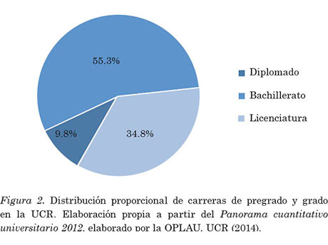 De conformidad con la información que proporciona la Oficina de Planificación Universitaria (OPLAU), en 2012 la UCR contaba con una oferta académica de pregrado y grado constituida por una cantidad total de 244 opciones, distribuidas de la siguiente manera: a) Diplomado: 24; b) Bachillerato: 135; c) Licenciatura: 85. La figura 2 muestra la distribución proporcional de las carreras de pregrado y grado en la UCR para el año 2012.