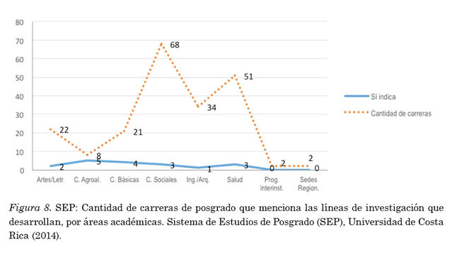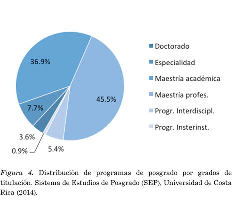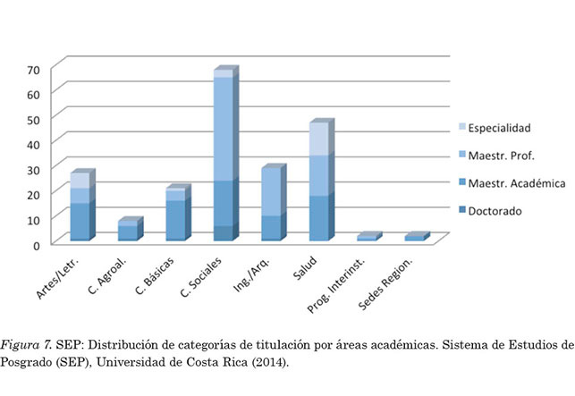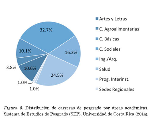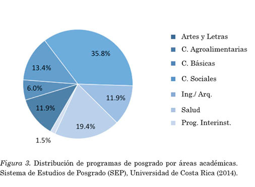 En la UCR, a partir de entonces, el posgrado se organizó en una conformación por programas. Al año 2014, en el SEP existen 67 programas inscritos, distribuidos proporcionalmente según se muestra en la figura 3. De los 67 programas, 6 poseen un carácter interdisciplinario y se sitúan en las siguientes áreas: Artes y Letras (1), Ciencias Básicas (1), Ciencias Sociales (1), Ingeniería y Arquitectura (1), Salud (2).