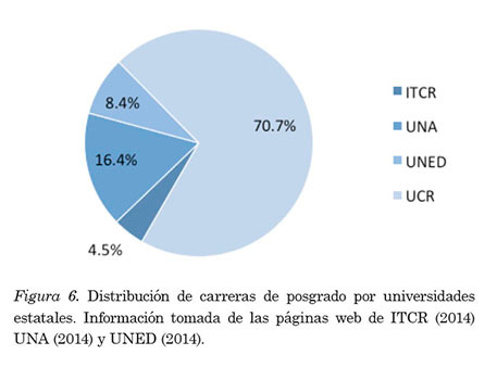 Otro dato que resulta finalmente de interés mencionar aquí es el de la comparación de la cantidad de carreras de posgrado de la UCR, en relación con las otras 3 universidades estatales del país que también cuentan con una oferta de titulación de posgrado: ITCR, UNA y UNED. Según la información que aparece en las correspondientes páginas web de esas instituciones, el ITCR cuenta con 14 carreras de posgrado, la UNA tiene 51 y la UNED 26. La distribución porcentual de las carreras de posgrado de estas instituciones presenta en la figura 6,