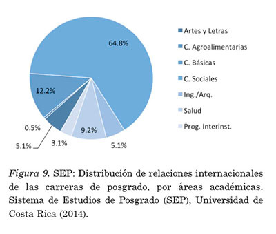 La cantidad de relaciones internacionales que se indican alcanza un total de 196, distribuidas por áreas académicas de la siguiente manera: a) Artes y Letras: 10 (16); b) Ciencias Agroalimentarias: 1 (6); c) Ciencias Básicas: 24 (20); d) Ciencias Sociales: 127 (70), Ingeniería y Arquitectura: 10 (25), Salud: 18 (92), Programas Interinstitucionales: 6 (2). Las cifras entre paréntesis se refieren a la cantidad de carreras de posgrado que existen en cada una de las diferentes áreas académicas. En la figura 9 se muestra por áreas académicas, la distribución porcentual de las relaciones internacionales que mantienen establecidas las carreras de posgrado de la UCR.
