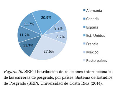 Las 196 relaciones internacionales se distribuyen en una totalidad de 25 países, con una alta concentración en 6 de ellos: Alemania, Canadá, España, Estados Unidos, Francia y México. Las restantes 54 relaciones se distribuyen en los demás 19 países, representan una proporción de 27,6%. Es importante destacar que México es el único país de América Latina que figura entre los 6 países con los que se tiene establecidas una mayor cantidad de relaciones. La figura 10 presenta la distribución porcentual por países, de las relaciones internacionales que informan tener las carreras de posgrado de la UCR.