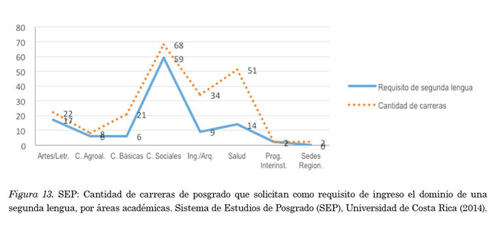 Se hizo una revisión respecto del dominio de una segunda lengua (o lengua extranjera), como requisito para ingresar a las carreras de posgrado. En total, son 85 las carreras que mencionan tener establecido dicho requisito; es decir, el 38,63% del total de las carreras de posgrado de la UCR. De esas 85 carreras, en el 96,47% de los casos, el requisito consiste en demostrar dominio instrumental o competencia de lectura en alguna segunda lengua. En la figura 13 se presentan los resultados generales obtenidos, distribuidos por áreas académicas:
