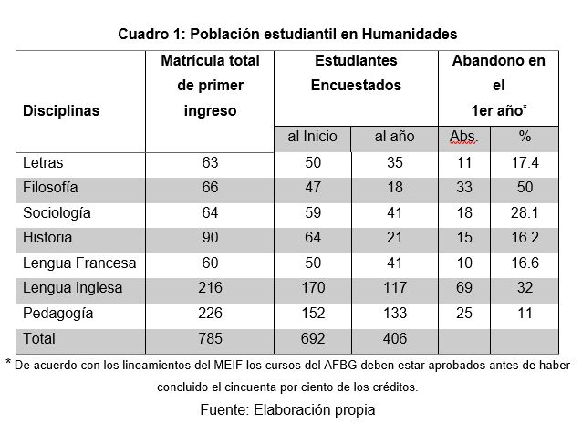 Las carreras objeto de estudio fueron siete (de corte humanístico y de Ciencias sociales). El método empleado fue mixto. En la parte cuantitativa, el diseño fue comparativo y longitudinal. La comparación se estableció entre las disciplinas bajo estudio, mientras que la perspectiva longitudinal se aplicó toda vez que tomamos como unidad temporal el primer año de estudios de la generación de estudiantes ingresada en agosto de 2011, y observamos la secuencia de todo ese periodo, de manera que para el 2012, hicimos un corte para saber qué había ocurrido con las trayectorias escolares.