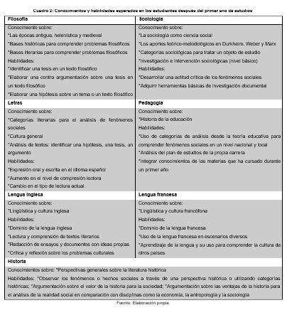 La segunda fuente fueron las entrevistas semiestructuradas a 10 académicos participantes en las reformas de sus programas educativos o en puestos directivos, y que tenían una opinión informada sobre los cambios en el currículum. El guion de entrevista exploró básicamente tres categorías: la percepción de ellos sobre lo que se consideraba debían ser los contenidos básicos de tipo disciplinario cuya apropiación por parte de los estudiantes era indispensable en el primer año. Mediante las preguntas ¿Cuáles conocimientos disciplinarios deben saber los estudiantes después de un año? y ¿qué habilidades deben dominar en ese lapso?, los académicos enlistaron lo que se esperaba de los estudiantes en ese sentido. Se resumen los aportes señalados.