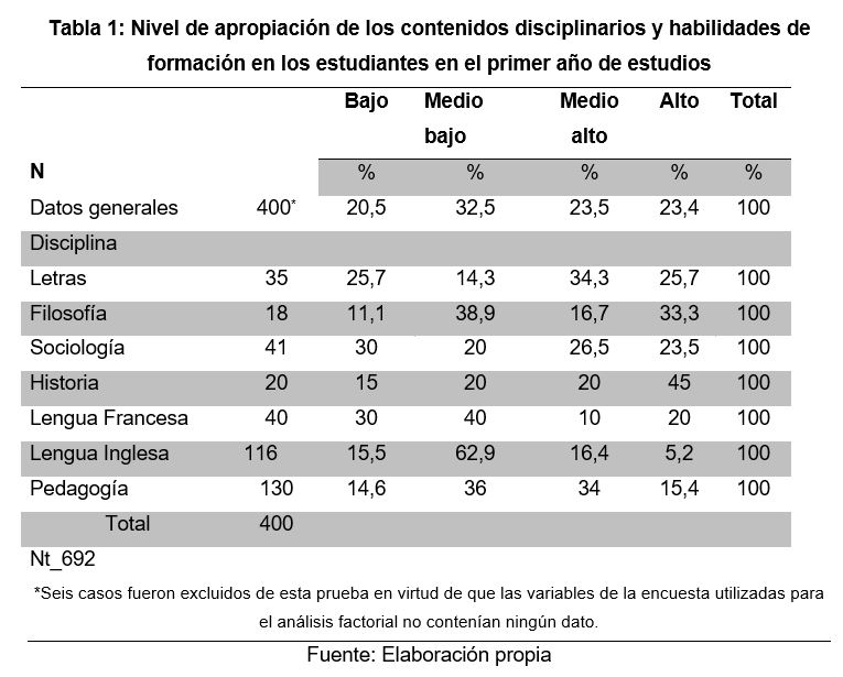 La segunda encuesta nos permitió conocer el nivel de apropiación logrado por los estudiantes con respecto a los contenidos disciplinarios. Debe señalarse que, en este segundo instrumento, se diseñó una sección especial para cada disciplina analizada. En esta sección, las preguntas estaban dirigidas a conocer dicho nivel de apropiación de contenidos durante el primer año. Los resultados se contrastaron siguiendo la técnica multivariada de análisis factorial.