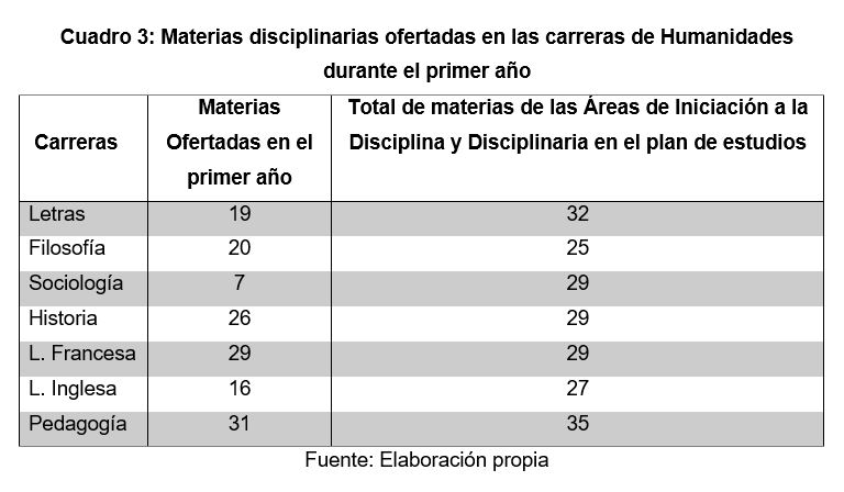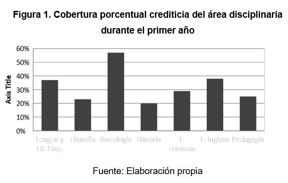 Un primer nivel de construcción estratégica indica que cada carrera organizó diferente su oferta semestral disciplinaria. Pedagogía, Lengua Francesa e Historia abrieron mucho su oferta disciplinaria, casi hasta agotar los cursos disponibles en el plan de estudios. En cambio Filosofía, Letras y Lengua inglesa fueron más conservadoras en su oferta crediticia. Sociología, la única ciencia social del conjunto, solo abrió siete cursos en el primer año. Observemos ahora la cobertura de las materias disciplinarias.