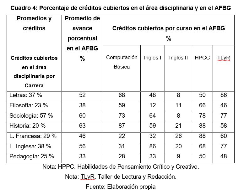 En el caso de Letras, se tiene que ofreció únicamente 19 materias de un total de 32 disponibles. Cómo avanzaron entonces en sus cursos del AFBG, al mismo tiempo que lograron uno de los porcentajes más elevados en los cursos disciplinarios si limitaron las materias en el primer año. En primer lugar, establecieron que uno de los cursos del AFBG, el de Taller de Lectura y Redacción, fuera prioritario porque este se relaciona directamente con el objeto de estudio de esta disciplina, de hecho el 86 por ciento de la población lo acreditó en el primer año.