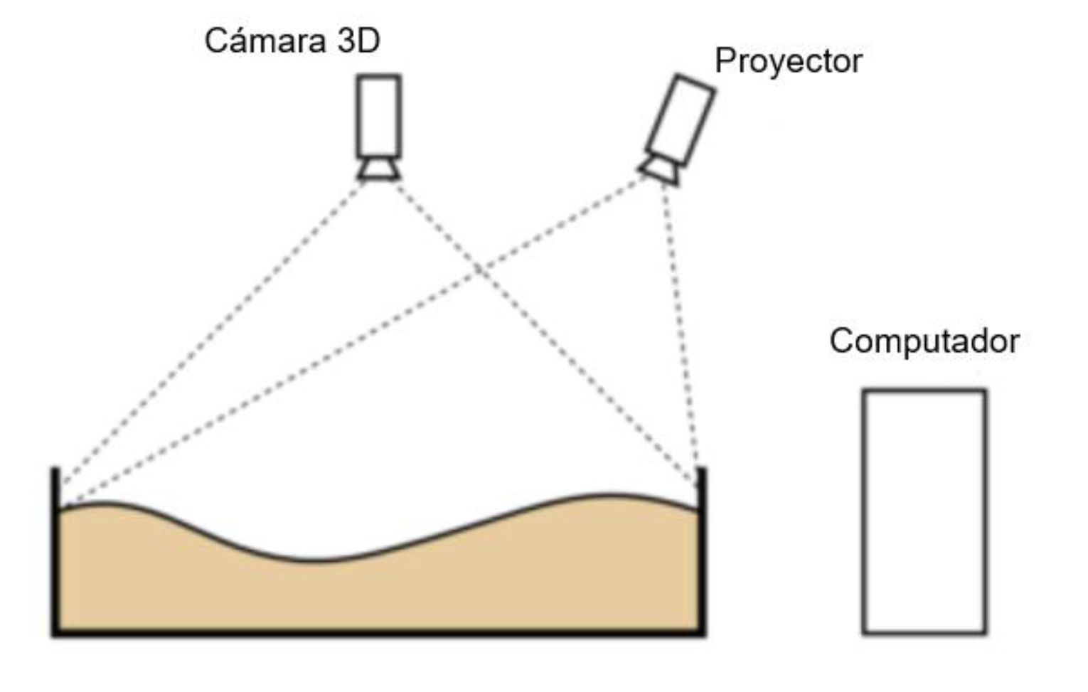 Este recurso didáctico y de investigación profesional consiste en una caja de arena con un sensor de profundidad (Kinect) el cual detecta y registra las condiciones del terreno (arena) y de la topografía (profundidad, rugosidad, condiciones de borde y movimiento de tierra-agua) (Barthele et al., 2023). La información recopilada se traduce por el software AR-Sandbox asignando colores en tiempo real según la profundidad del terreno para su posterior visualización mediante un proyector sobre la caja de arena (Figura 1).