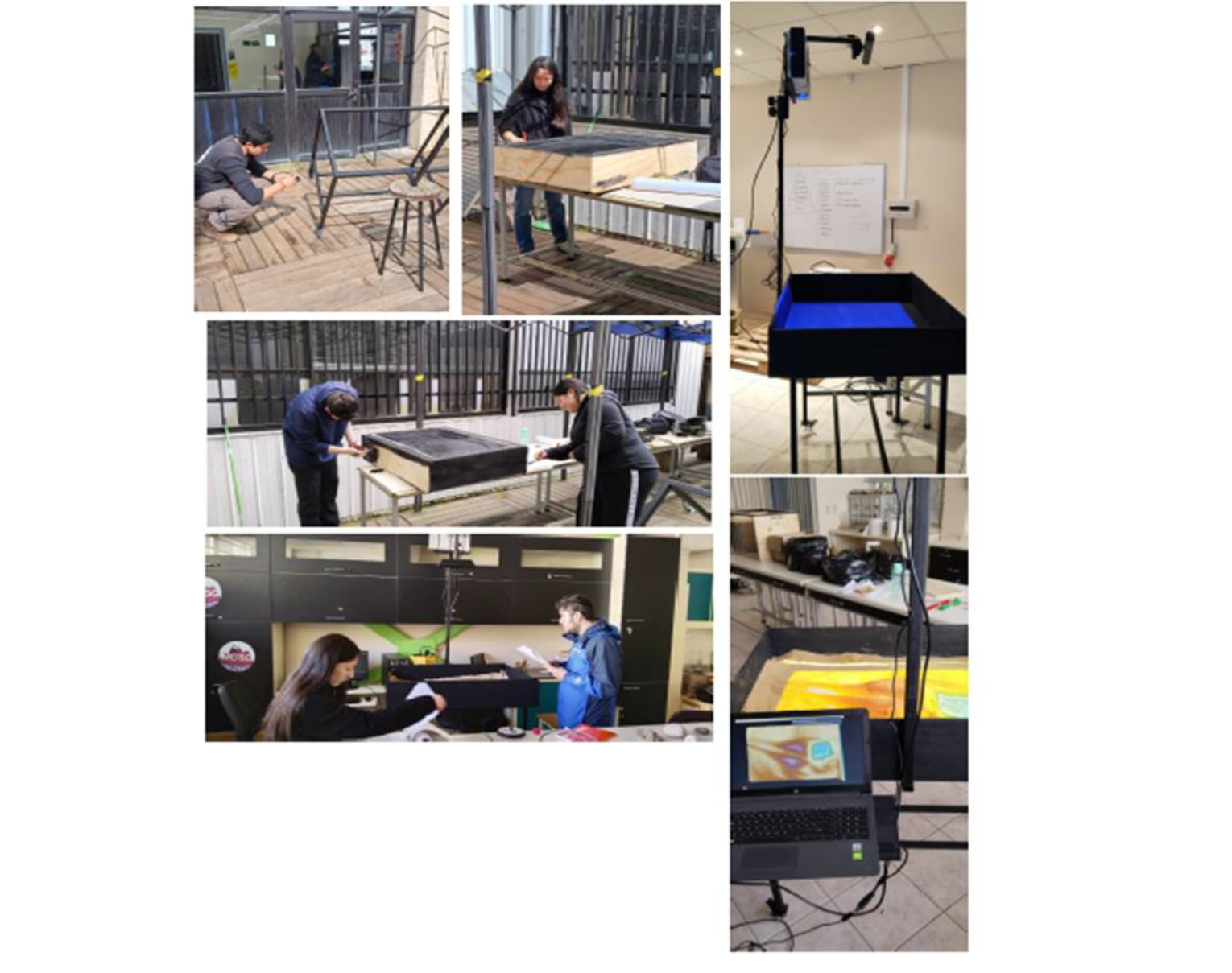 La construcción del recurso didáctico se concretó con trabajo colaborativo entre un grupo de estudiantes y un equipo de profesores/as de la carrera de Geografía de la Universidad de Concepción (Figuras 2 y 3) basada en la versión SARndbox-2.8 (Kreylos, et al., 2016). Las especificaciones de la caja de arena son 0.75m x 1m x 0.20m que sostienen un sensor Kinect 1 (1414) XBOX® 360 (Microsoft, USA) y un proyector de tiro largo SONY®. Este último se colocó a una altura de 1m para su correcta proyección sobre la caja. El computador tenía 8GB de RAM, disco duro de 512GB, pantalla de 15.6″ y una tarjeta de video NVIDIA MX550 de 2GB. El sistema operativo instalado en el laptop fue Linux 21.3 Mint Virginia (https://www.linuxmint.com/download.php).