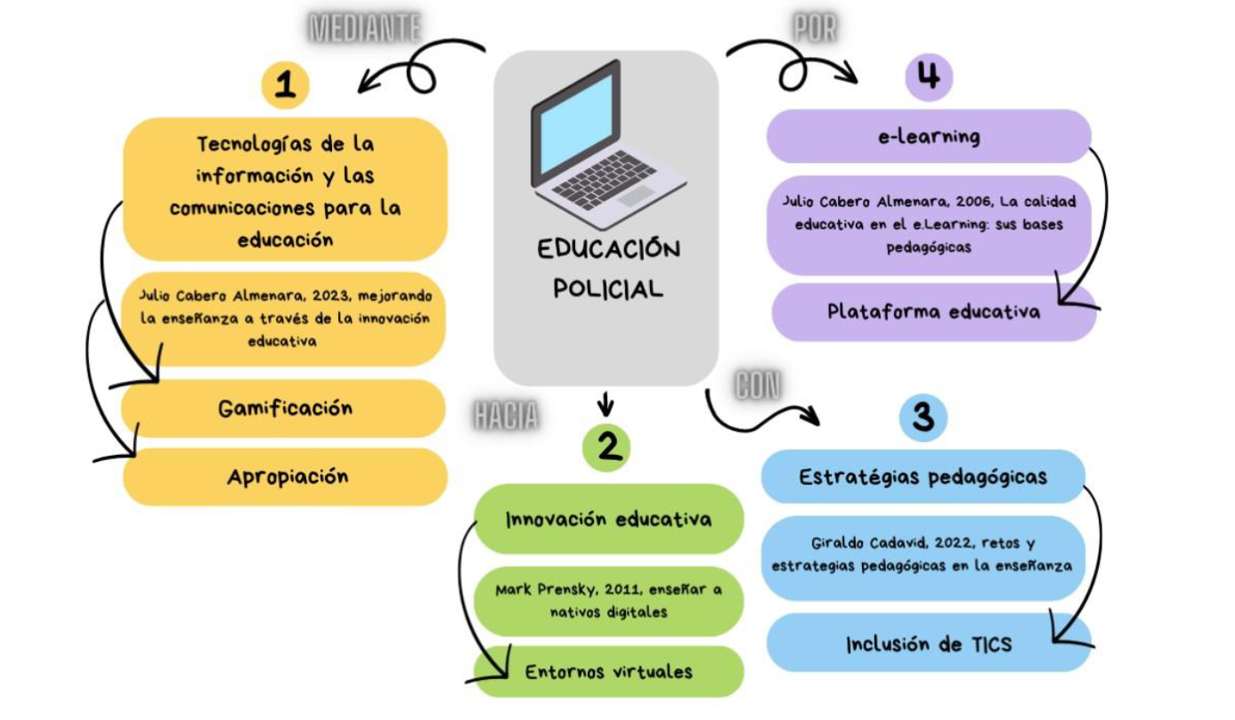 Para el desarrollo del artículo fueron tomadas diferentes teorías y referentes conceptuales que se consideraron relevantes, tales como: tecnologías de la información y las comunicaciones para la educación, innovación educativa, estrategias pedagógicas y e-learning. En la Figura 1 se muestra la manera en la cual estas teorías se relacionan con la educación policial y los conceptos que se desprenden de cada una de ellas.