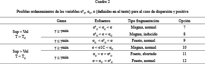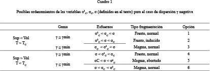 La columna siguiente muestra la posición relativa del stress crítico efectivo respecto al stress externo σ y al stress crítico σC . Le sigue una columna con una brevísima descripción del tipo de fragmentación posible: magmática, si 0< H < ½, y freatomagmática si ½ < H < 1. El término “normal” indica que la existencia de un nuevo stress crítico no afecta el proceso; por “abortada” debe entenderse que el proceso se ve afectado negativamente, requiriéndose de un mayor stress externo para producirse. Inversamente, cuando el stress externo requerido es menor que el esperado se denominará “inducido”.