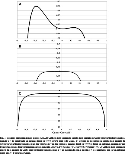 Para su análisis utilizaremos los tres gráficos de las dos primeras ecuaciones, correspondientes al caso Alfa (Fig. 1). En la figura 1a se observa que para valores positivos de τ (τ = 1, en este caso), se obtiene un mínimo local para γ = 0, como lo propone Landau. Sin embargo, este mínimo se convierte en un máximo global a partir de los valores positivos de τ = 0,846 y τ = 0,637 (Fig. 1b), y no de valores negativos como lo propone Landau. Más aun, para valores de τ negativos (Fig. 1c) , la energía de Gibbs muestra mínimos globales de G → -∞ , cuando γ→ ± 1. Tradicionalmente estos mínimos globales infinitos se interpretarían como un defecto de la teoría, pues la energía de Gibbs se espera que esté limitada por abajo. En el caso aquí estudiado, la dispersión γ está controlada por un proceso de fragmentación secuencial que aporta la energía extra necesaria. De la distribución de Weibull obtenida por Brown (1989) se observa que γ = -1 está también asociada con un ∞, límite al que nunca se llega pues la fragmentación no puede continuar eternamente.