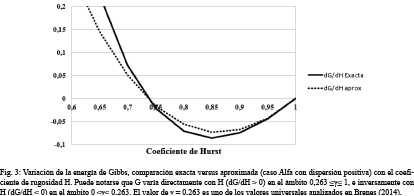 A lo largo del presente estudio se ha utilizado la dispersión γ como el parámetro de orden. Sin embargo, el análisis puede también llevarse a cabo utilizando el coeficiente de rugosidad o de Hurst, H= 1- γ. Usando α = (dH–d+1)/2H, y D = 3(1+γ) la ecuación (2) genera la figura 3, en la que dG/dγ = -dG/dH es expresada en función de H.