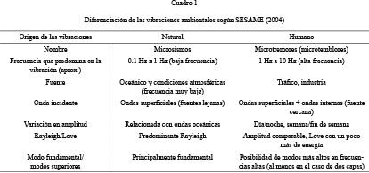 Las vibraciones ambientales (o ruido como lo denominan algunos autores) tienen dos orígenes: natural y humano. El cuadro 1 muestra la diferenciación entre estos dos tipos y que representa el consenso al que llegó el grupo del proyecto SESAME (2004) quien se ha dedicado durante varios años al estudio y uso de este tipo de mediciones.