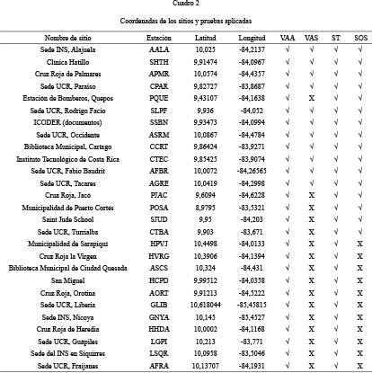 En el cuadro 2 se muestra los sitios donde se realizaron las pruebas, específicamente el nombre de la estación acelerográfica, las coordenadas, y los tipos de mediciones hechas. Se señala además los casos en que se aplicó alguna de las técnicas (con √) o si no se hizo (X).