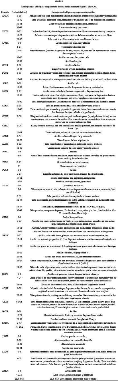 En el cuadro 3 se presentan en forma resumida las descripciones de las litologías de cada uno de los sitios bajo estudio, a partir de información disponible al público por parte del Servicio Nacional de Aguas Subterráneas Riego y Avenamiento (SENARA), hasta al menos 30 m de profundidad medidos a partir de la superficie. Se observan casos como APMR y HCPD donde se evidencia la presencia de materiales más blandos en profundidad, situación que suele ser atípica. En algunos casos, las descripciones disponibles son poco claras y hasta contradictorias, por lo que esta información no se utilizará como criterio base para la clasificación, sino más bien como una referencia. Los sitios que no aparecen corresponden a casos donde la información de posos no está disponible.
