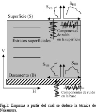 Desde el punto de vista de su justificación, el método H/V parte de que las vibraciones ambientales están compuestas por varios tipos de ondas y considera que estas son similares horizontal y verticalmente en el basamento. Las vibraciones son amplificadas por las distintas capas del suelo, sufriendo las componentes horizontales multirreflexiones de la onda S, por lo que se ven amplificadas mientras que la componente vertical sufre un fenómeno semejante pero para la onda P. La figura 1 muestra la terminología que se emplea en la deducción del método.