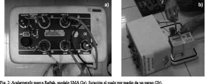 VAA, vibraciones ambientales registradas con acelerógrafo: corresponden a registros de aceleración obtenidos por instrumentos triaxiales marca Reftek, de 24 bits, modelo SMA con memoria de estado sólido (MEMS) y una escala completa de 2g. La figura 2 muestra este instrumento y la figura 2b se muestra la forma en que se ancla al suelo para evitar que, ante la ocurrencia de un sismo fuerte, se produzca una amplificación del movimiento debido al movimiento relativo entre el acelerógrafo y el suelo. Las mediciones fueron hechas en tres distintas horas del día: 2 am, 8 am y 3 pm, para comparar las razones espectrales según el nivel de ruido presente. En todos los casos, las ventanas de tiempo utilizadas fueron de 15 minutos.