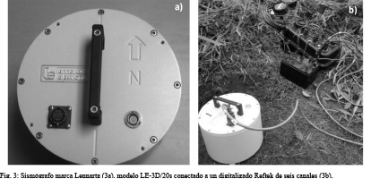 VAS, vibraciones ambientales registradas con sismógrafo: se utilizó un instrumento triaxial marca Lennartz, modelo LE-3D/20s conectado a un digitalizador Reftek de seis canales, tal y como lo muestra la figura 3. Las mediciones se realizaron cerca del acelerógrafo instalado en forma permanente, durante horas del día. En todos los casos se registraron ventanas de 15 minutos de duración. En la fig. 3b se observa que el instrumento no se ancla al sitio, sino simplemente se apoya en superficie, sea esta una losa o el suelo. Esto es válido ya que la técnica VAS solamente se aplicó para la medición de vibraciones ambientales, que son de muy baja intensidad y que no va a generarse una posible amplificación debida al movimiento relativo del sensor respecto a la superficie.