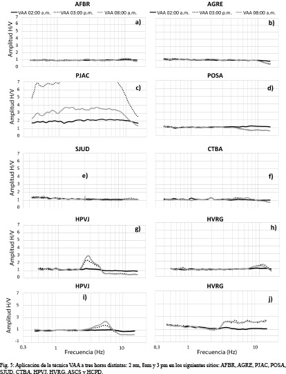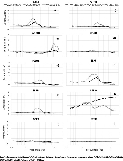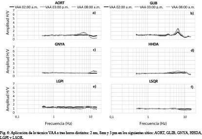 La VAA se aplicó para tres horas del día distintas: 2 am, 8 am y 3 pm. A pesar de evidenciarse niveles de amplificación y formas distintas en varios de los 26 casos estudiados, fueron las mediciones hechas a las 3 pm las que mostraron una mejor definición de las razones espectrales. Lo anterior debido probablemente a que el nivel de energía de las vibraciones ambientales a las otras horas del día es muy bajo, por lo que no se logran identificar picos sobresalientes en el gráfico.