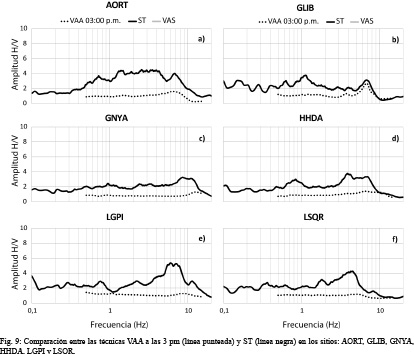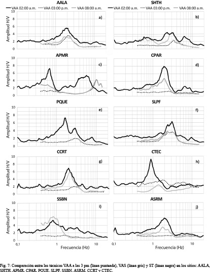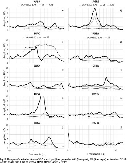 Se compararon además las técnicas VAS con ST en 12 sitios y en un 75% se observan coincidencias, aunque la VAS muestra inferiores niveles de amplitud. Por lo tanto, para la identificación aproximada de la frecuencia fundamental, si se puede utilizar la VAS como aproximación de la ST, tal y como lo propone Nakamura (1989), lo que implica una forma sencilla y práctica de lograrlo, ya que puede obtenerse en cualquier momento y con mediciones de corta duración. Sin embargo, debe recordarse que no siempre se logran resultados adecuados, principalmente cuando no hay un contraste significativo entre impedancias o este es muy profundo, tal y como se mencionó antes, por lo que la VAS debe aplicarse con cautela y preferiblemente combinarla con otras técnicas.