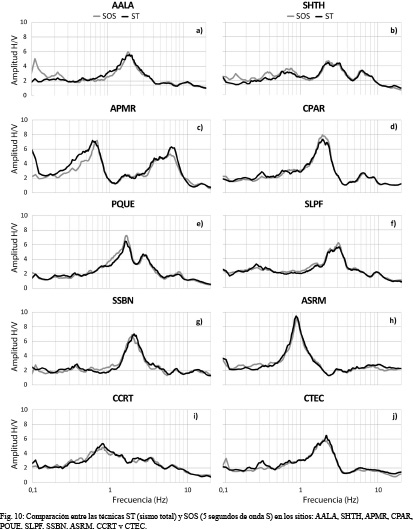La comparar las técnicas de ST (sismo total) con SOS (sismo onda S) en 12 sitios, se logra observar que el 94% de los casos muestran una forma muy semejante entre las razones espectrales, así como la misma definición del pico máximo, por lo que la aplicación de una u otra técnica es indiferente, Sin embargo, la SOS implica un poco más de trabajo para definir visualmente o por medio de algoritmos el arribo de la onda S, por lo que su aplicación se vuelve más lenta, aún cuando se requiere una menor cantidad de cálculos para su aplicación ya que las ventanas utilizadas son de menor duración.