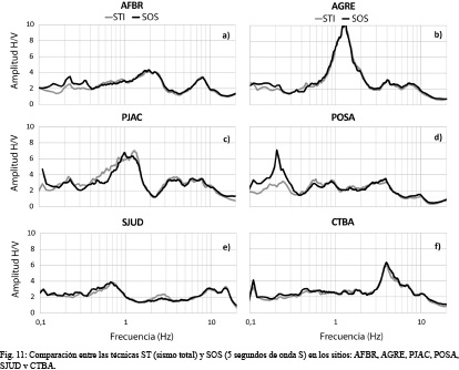 Los siguientes sitios muestran algunas singularidades: AFBR, AGRE, PJAC, POSA y PJAC. Todos ellos difieren levemente su amplitud en frecuencias inferiores a 0,9 Hz pero definen en forma semejante la frecuencia fundamental de cada sitio, que normalmente se ubica en frecuencias superiores a ese valor, por lo que no afecta su identificación si se utiliza una técnica u otra. Solamente el caso de SJUD (Fig. 11e) muestra, además de este rango de frecuencias, diferencias significativas en amplitudes en un rango de 2 a 3 Hz, probablemente asociadas a la inestabilidad de los materiales característicos de ese emplazamiento (ver cuadro 3).