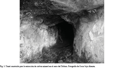Desde la tercera década del siglo XX la mina fue lentamente abandonada y absorbida por la naturaleza hasta borrar sutilmente sus rastros y caminos. En la actualidad dicha estructura (Fig. 3) es un refugio de murciélagos y punto de visita por parte de vecinos del lugar. En expedición realizada el 24 de agosto de 2018 se hizo una ascenso al cerro para entrar al túnel hecho con el fin extraer el carbón. Se observaron areniscas de espesor métrico en la boca del mismo. Ya dentro de la oquedad, y a unos 10 metros de la entrada, se observaron capas de carbón intercaladas con lutitas ricas en materia orgánica. Son estratos de espesores centimétricos y color negro. El lugar es muy húmedo por lo que la base del túnel está llena de agua, lo que hace muy difícil avanzar hacia el interior del mismo.