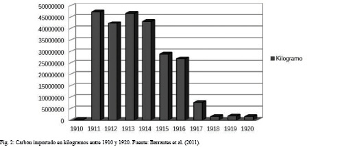Por otra parte, las estadísticas nacionales sobre bienes de subsistencia importados, realizadas por la Dirección General de Estadística y Censos, revelan que los niveles de importación de carbón en Costa Rica pasan por dos momentos difíciles, provocando la caída en la importación, la cual tiende a la baja de forma súbita a partir de 1914. En la figura 2 se observa que la importación de carbón se intensificó en Costa Rica a partir del 1910 y que se mantuvo con alto nivel hasta 1914. A partir de tal años empezó a decrecer drásticamente.