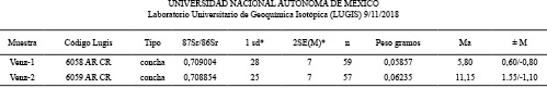 Las muestras de Sr se cargaron como cloruros sobre filamento doble de renio y se midieron como iones metálicos. En cada corrida se analizaron 60 relaciones isotópicas para Sr. El software integrado arroja outliers dependiendo de la estabilidad de la señal. Los valores Los valores (1sd = ±1s abs) se refieren a los errores durante la medición, en los últimos dos dígitos. 2 SE(M) = 2s abs /raíz n. Todas las relaciones isotópicas de Sr se corrigieron por fraccionamiento de masas vía normalización a 86Sr/88Sr = 0.1194. Valores del LUGIS para el estándar NBS 987 (Sr): 87Sr/86Sr = 0.710253 ± 12 (±1sabs, n = 81). Los blancos analíticos obtenidos en el tiempo de los análisis de las muestras de este trabajo resultaron 0.37 ng Sr (blanco de química).