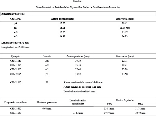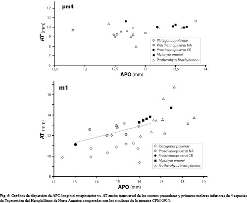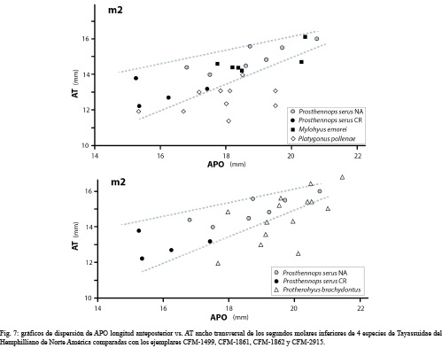 El pm4 presente en la hemimandíbula derecha (CFM-2915) presenta dimensiones AT y APO que lo ubican fuera del rango de Mylohyus elmorei y Platygonus pollenae y lo ubican dentro de la nube de Protherohyus brachydontus y Prosthennops serus (Fig.6 gráfico superior). En el caso del m1, aunque roto, se estimó su longitud APO y se midió su longitud AT, permitiendo ubicarlo en el rango de tendencia de Prosthenops serus (Fig. 6, gráfico inferior), dejándolo fuera del rango de las restantes especies hemphillianas tardías de tayassuidos.