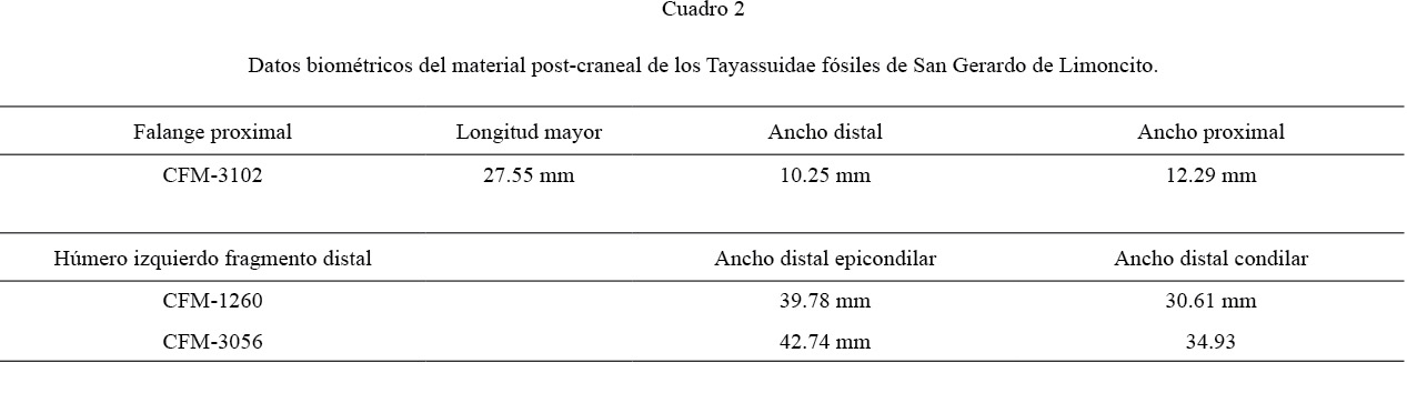Escasos fragmentos del post-cráneo de tayassuidos fueron recuperados en la localidad de San Gerardo de Limoncito. El CFM-3102 es una falange proximal (Fig. 9) y el CFM-3056 y el CFM-1260 corresponden a 2 fragmentos de húmero izquierdo (Figs. 10.1 y 10.2), el CFM-3842 es un fragmento radio ulnar (Figs. 10a-c).