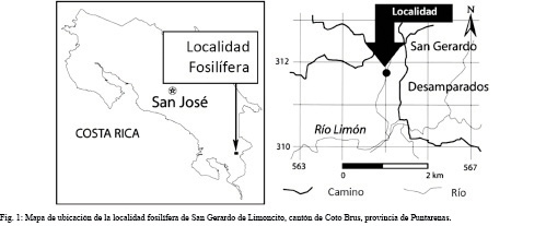 Los objetivos de la presente publicación es dar a conocer el primer registro fósil de pecaríes para Costa Rica y describir el material dental, craneal y post-craneal de Tayassuinae colectado en la localidad de San Gerardo de Limoncito, ubicada 14 km al oeste de la ciudad de San Vito en el cantón de Coto Brus, provincia de Puntarenas en las coordenadas 8º51’19.6’’ N y 83º04’51.9’’ W (Fig. 1), cuya edad ha sido asignada al Hemphilliano Temprano tardío (Mioceno Tardío).