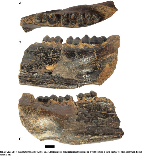 Ejemplar CFM-2915, es un fragmento de ramo mandibular derecho con pm4-m3 bien preservados el m1 esta roto y solo se preservaron las cúpides anteriores (Fig. 3). El CFM-1861 corresponde a un fragmento mandibular derecho con el m2 muy bien preservado (figura 4.1a-c). El CFM-1862 corresponde a la corona de un 2m (Fig. 4.2a-c) y el CFM-1499 a un m2 (Fig. 4.3a-c), ambos bien preservados.