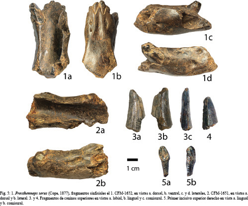 Ejemplares CFM-1652 (fig. 5. 1a-d) y CFM-1651 (fig. 5. 2b) corresponden a 2 caninos superiores, el ejemplar CFM-1867 correspondiente a un tercer incisivo superior (fig.5. 5a-b) y dos fragmentos sinfisiales correspondientes a los ejemplares CFM-1651 y CFM-1652 (figs. 5.2 y 5.1).
