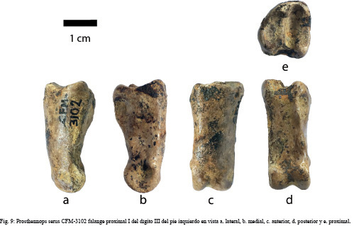 Descripción: el CFM-3102 corresponde a una falange proximal completa con la superficie proximal de contorno redondeado más o menos oval (Fig. 9).