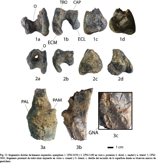 En el caso de los fragmentos distales de húmeros izquierdos, es posible deducir que se trata de 2 individuos de tallas ligeramente diferentes, el ejemplar CFM-1260 (Figs. 10.2a-d) es en general más pequeño, pero su tróclea es ligeramente más robusta que la que presenta el ejemplar CFM-3056 cuya talla general es ligeramente mayor (Figs. 10. 1a-d).