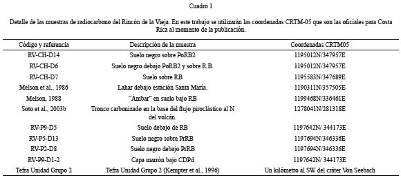 Hasta el año 2017, solo existían 4 dataciones de radiocarbono en el volcán Rincón de la Vieja, donde cada autor aportaba una edad: 1) Melson, Barquero, Sáenz y Fernández (1986), 2) Melson (1988), 3) Kempter et al. (1996) y, finalmente, 4) Soto et al. (2003b). El presente trabajo casi duplica el número de edades de radiocarbono.