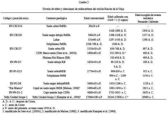 Referente a dataciones subrecientes, Kempter et al. (1996) data una muestra con 14C en 27000 ± 560 años, del lado sur del cono Von Seebach, correspondiente a la erupción explosiva más antigua datada de la fase eruptiva subreciente del Rincón de la Vieja (Tefra Unidad Grupo 2, sensu Kempter, 1997). Además, cita la datación realizada por Melson (1988) de 3490 ± 105 a. P. correspondiente a una muestra de copal (erróneamente llamado ámbar en el trabajo original) contenido en el suelo debajo del depósito de tefra Río Blanco. La edad procedente de este paleosuelo debajo de Río Blanco, como se detalla más adelante, posee un rango temporal más amplio, por lo que solo apunta a una edad máxima de la capa Río Blanco, pero no es la edad del evento explosivo (ver Cuadro 2, Fig. 2).