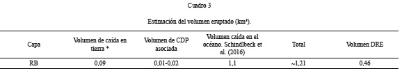 Schindlbeck et al. (2016) estima el volumen de 1,1 km3 para la capa RB en la tefra depositada en el fondo oceánico pacífico, el cual es superior al estimado por Kempter (1997) de 0,25 km3 en tierra. Ahora, con los datos nuevos recolectados, junto con los de Kempter (1997) y Barahona et al. (2001), todos ellos sirven para dar cierre y detalle a los valores proximales a distales al cráter, por lo que se puede realizar una mejor estimación del volumen eruptado. De la integración de los espesores en tierra, el volumen sería de 0,09 km3 (muy inferior al estimado originalmente). Para calcular el volumen de roca densa equivalente (DRE en inglés) se asume una densidad del depósito de 1000 kg/m3 y una densidad del magma dacítico de 2600 kg/m3 y utilizamos el valor del volumen total, lo que nos da un valor de volumen DRE de 0,46 km3 (Cuadro 3).