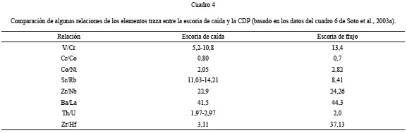 Ya Soto et al. (2003b) habían notado similitud geoquímica y petrográfica entre la pómez de la CDP y aquellas de caída, pero no tanto en las escorias entre ambos, aunque concluyeron que no eran eventos coetáneos con base en el número reducido de dataciones disponibles. En el presente trabajo, no solo se concluye que son eventos contemporáneos, sino, además, que son comagmáticos, dado que las relaciones de los elementos traza son similares (Cuadro 4). Melson (1988) describe que la capa RB está compuesta por dos subsets el cual cada uno tiene a ser composicionalmente más ácido, una secuencia que suele ser inversa a lo observado en tefras composicionalmente zonadas. Sin embargo, el subset superior es más básico que el primero. Él pensó que un magma marginal, más viscoso y fraccionado, ingresó, mientras que el magma del tope de la cámara magmática era menos viscoso y más rápidamente fluyó hacia la porción central del cuerpo magmático. En tal caso, más estudios geoquímicos son requeridos.