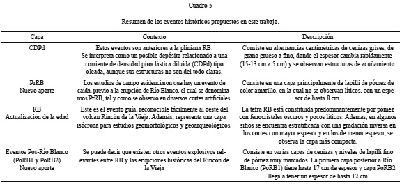 Con base en las dataciones realizadas, se definen cinco eventos volcánicos importantes que se presentaron en el Rincón de la Vieja en los últimos 6000 años (Holoceno Medio y Superior): 3650 a. C., 1130 a. C., 460 d. C., 1040 d. C. y 1650 d. C. Lo anterior amplía significativamente el calendario eruptivo prehistórico del volcán Rincón de la Vieja.