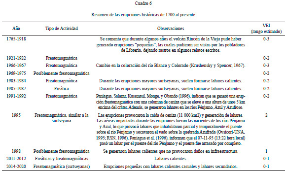 Entre 1960 y 1980, la limitada experiencia de los eventos eruptivos del Poás (1952-1955), Irazú (1963-1965) y Arenal (1968) dieron las bases para que se prestara una mayor atención a lo que acontecía en el Rincón de la Vieja (Cuadro 6).