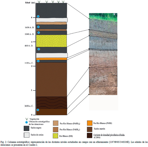 Soto (2010) indica que en las áreas medias y distales la ceniza sobreyace a la tefra RB, pero debido al rango de edad que se manejaba anteriormente (3700 a. P), lo hacía concluir que no había erupciones de importancia posteriores a RB. Sin embargo, en los estudios de campo realizados en el presente estudio durante el 2017-2018, aportan nuevos datos que restringen la edad de los depósitos más recientes, con edades más jóvenes de lo que se pensaba.
