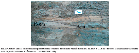 Estos eventos son anteriores a la pliniana RB. Consiste en alternancias centimétricas de cenizas grises, de grano grueso a fino, donde el espesor cambia rápidamente (15-13 cm a 5 cm) y se observan estructuras de acuñamiento (Fig. 3). Se interpreta como un posible depósito relacionado a una corriente de densidad piroclástica diluida (CDPd) tipo oleada, aunque sus estructuras no son del todo claras. Este hallazgo se da debido a un corte en profundidad de aproximadamente 5 m, desde la superficie.