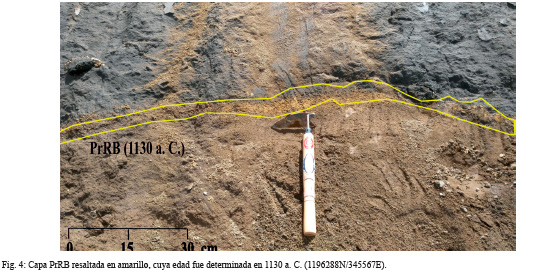 Los estudios de campo realizados en el 2017 evidenciaron que hay un evento de caída, previo a la erupción de RB, el cual se denomina acá PrRB, tal y como se observó a lo largo de diversos cortes artificiales al oeste del volcán Rincón de la Vieja, por lo que se le dio seguimiento. Consiste en una capa principalmente de lapilli de pómez amarillo, en la cual no se observan líticos, con un espesor de hasta 8 cm. En la plazoleta 2, el espesor es de 7 cm y se logra identificar fácilmente, cosa que no ocurre en otros sectores donde la capa apenas se logra observar, ya que se encuentra muy mezclada con el suelo (Fig. 4 y 5).